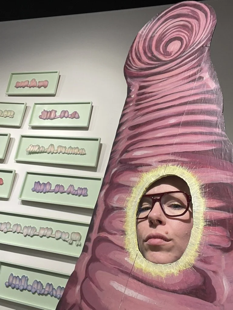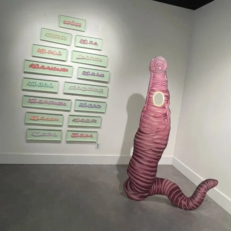Selections from the Becoming Wormtrain project were on display in Fall 2025 at the Samford University Art Gallery as part of the Art and Design faculty exhibition. The installation included 15 framed worm train drawings, a framed copy of The Wormhole, a worm-themed photo op from the April 2025 Wormtrain event, and takeaway materials — stickers and printed newspapers — inviting the work to circulate beyond the gallery.